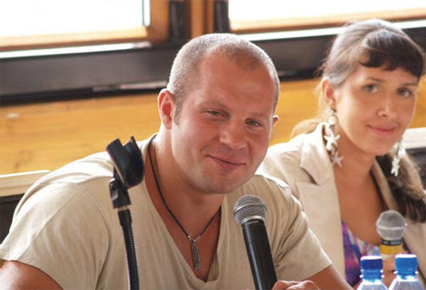 Наталья Буланова и Федор Емельяненко на пресс-конференции на паруснике «Летучий голландец», июнь 2007 г.