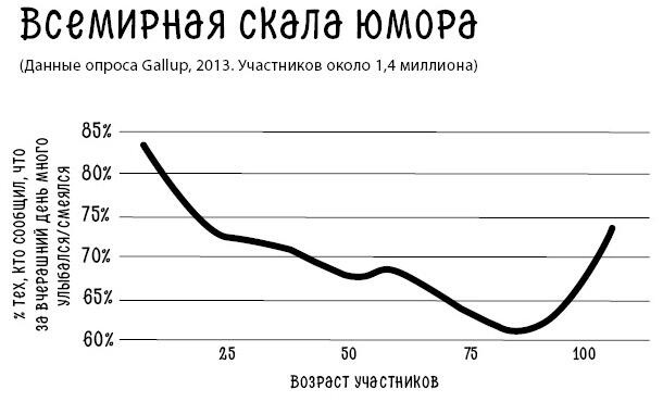 На дне той пропасти к нам присоединяется большинство из 1,4 миллиона участников опроса Gallup, проведенного в 166 странах[6]. Респонденты показали, что интенсивность нашего смеха или улыбок начинает снижаться в возрасте около 23 лет.