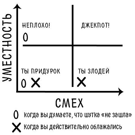 Левая половина диаграммы, согласно нашему надежному барометру смеха, представляет то, что мы обычно склонны считать неудачей: иными словами, если никто не засмеялся. Но, если вы окажетесь в верхнем левом квадранте, все не так уж плохо! Даже юмор, который не вызывает смеха до колик, оставляет вас в лучшем положении, если считается уместным повышает восприятие окружающими вашей уверенности и не оказывает значимого влияния на статус или компетентность[15].