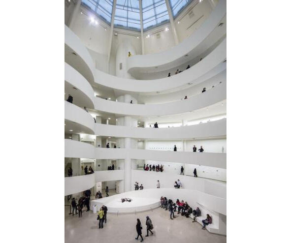 Бинони яратиб, Ф. Л. Райт анъанавий музейдан узоқлашди қўшни биноларни кўздан кечираётган меҳмонлар худди шу тарзда қайтишга мажбур бўлган қурилмалар. Гуггенхайм музейида томошабинлар биринчи навбатда лифтни юқори қаватга олиб чиқадилар, сўнгра спирал рампадан тушадилар ва кўргазма билан танишадилар. Узунлиги 400 м бўлган атриумга олти қаватли заллар, шунингдек, 1992 йилда асосий бинога бириктирилган қанотнинг янги бинолари туташган. Ташқи томондан, музей тескари пирамидал минорага ўхшайди. Ушбу бино 20-аср меъморчилигининг энг ёрқин асарларидан бири ҳисобланади.