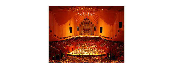 Aслида, бу бино органик архитектуранинг асосий тамойилларини амалга оширади. Лойиҳа 14 йил давом этди. Бинонинг концепцияси оддий: иккита амфитеатр ўрнатилган платформа. Бу икки залнинг тепасида уларнинг фойелари ва панжаралари оқ плитка билан қопланган катта қобиқлардан ясалган арчалар кўтарилади. Бино 2,2 гектар майдонни эгаллайди. Унинг узунлиги 185 м, максимал кенглиги 120 м. Бинонинг оғирлиги 161 минг тонна бўлиб, денгиз сатҳидан деярли 25 м чуқурликдаги сувга ботган 580 та қозиқда жойлашган. Тингловчилар ва меҳмонлар катта зинапоя, ҳайкалчали бетон нурлар остидан юриб, шаҳар томонидан бинога яқинлашадилар; кейин улар асосий платформа даражасига кўтарилади ва қабулхонага киради.
