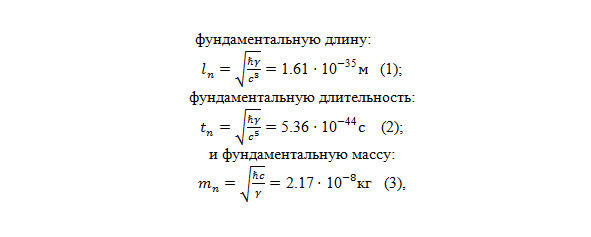 В квантовой теории, предлагающей частично-волновой дуализм, неопределенность физического описания микроскопических объектов возводится в принцип, носящий имя Вернера Гейзенберга. Из гейзенбергских соотношений неопределенностей следует, что пространство и время должны быть квантовыми. Для того, чтобы найти их значения обратимся к основным константам Мироздания: гравитационной постоянной γ = 6.67 1011 Нм2кг-2, скорости света с =3 108 мс-1 и постоянной Планка ћ = 1.05 1034 Дж с.