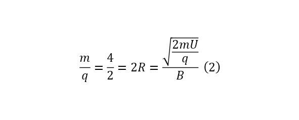 Этот газ засасывается в систему, ведя за собой иные молекулы, если таковые имеются, из-за того, что массы разных атомов и ионов разные, то попадая в магнитное поле, их радиус будет разным, что позволит определять вид введённой частицы. При этом константу m/q для него нужно настроить по (2).