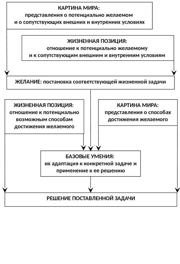 Итак, человек как-то представляет себе окружающий мир, чего-то в нем хочет и какими-то способами пытается желаемого добиться. То, как человек представляет себе окружающий мир, мы обозначили понятием картины мира; то, на основе чего он выбирает желаемое понятием жизненной позиции; то, какими способами он этого добивается понятием базовых умений.
