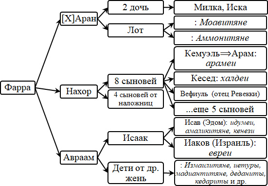 По сведению «Бытия», семья Авраама состояли из 3-х сыновей [Х]Арана, Авра[а]ма, Нахора и родителей. Жизнь в Уре семьи Фарры Библия характеризует в основном 2-мя событиями: (a) Все 3 сыновья женились там; (b) Умер старший сын семьи Арран, оставив после себя сиротами 3-х своих детей: Лота и 2-х дочерей: Милку и Иску (Быт. 11:29). О дальнейшей жизни вдовы Аррана и его младшей дочки Иски в Библии ничего не сообщается. Нахор женился на одной из его осиротевшей дочерей, Милке. А Авра[а]м на Сар[р]е неизвестной до этого героине Библии. О ранней жизни Сар[р]ы Библия не даёт никаких сведений, кроме того, что в трудной ситуации Авраам объявляет её своей сводной сестрой (Быт. 10:12). Исходя из порядка женитьбы братьев, можно сделать вывод, что Арран был старшим, а Нахор младшим братом Авраама, но этот вывод может быть не вполне удовлетворительным для Авраама и Нахора (т. к. трудно определить порядок их женитьбы; кроме того, в порядке женитьбы сыновей мог не соблюдаться принцип старшинства). Но старшинство Аррана мало вызывает сомнения, поскольку когда у него была дочка в половозрелом возрасте, другие его братья были ещё холостыми[12].