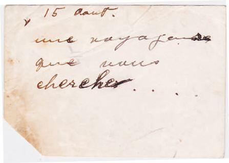 На оборотной стороне фотографии, вполне возможно, предназначая ее Антуану де Сент-Экзюпери, Консуэло написала по-французски, с не совсем правильной орфографией: «15 августа. Путешественница, которая вас искала».