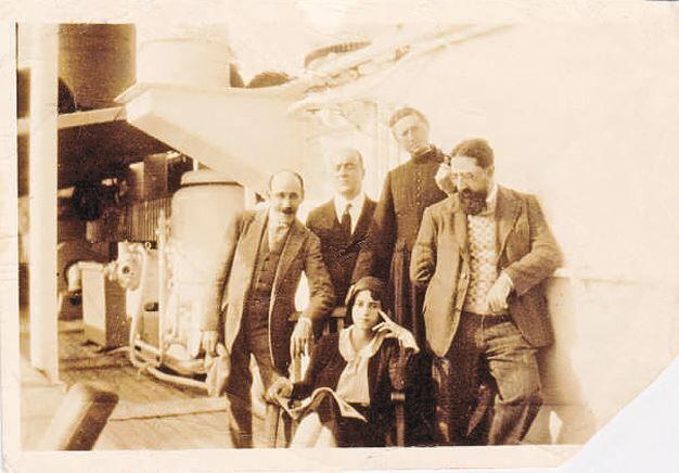 На пакетботе «Массилия», направляясь в Буэнос-Айрес, Консуэло Гомес Каррильо в обществе пианиста Рикардо Виньеса (слева), пастора-иезуита Пьера Ланда и писателя Бенжамена Кремье (справа), август 1930.