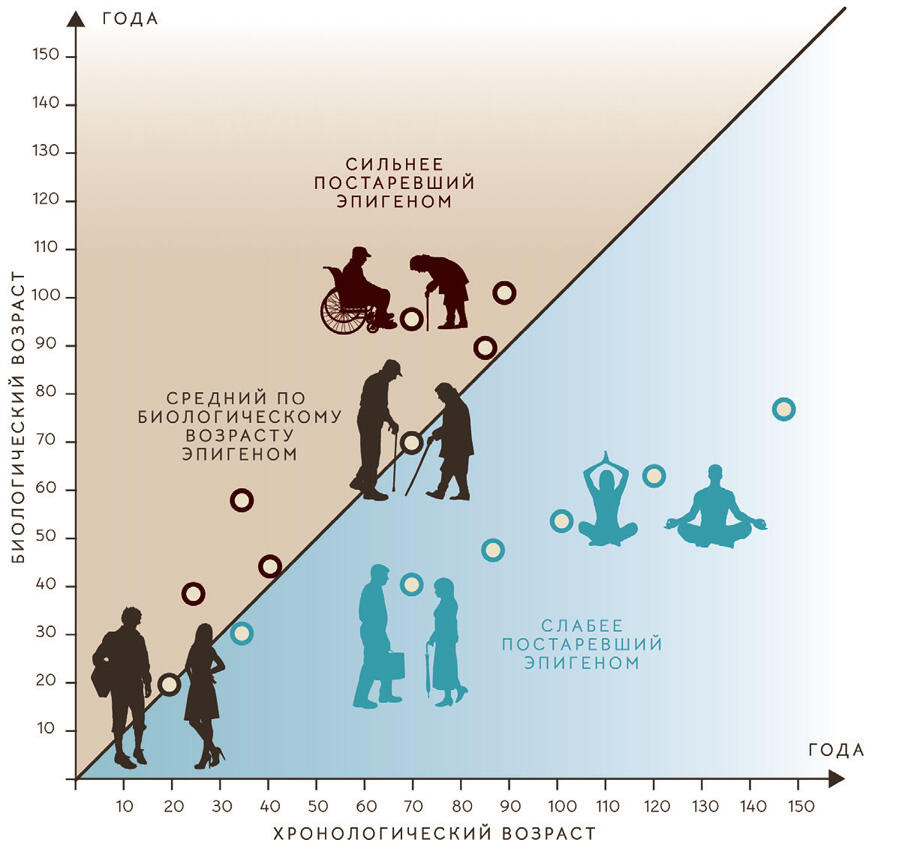 Я хочу показать, что биологический возраст может быть и вне времени. То, насколько мы быстро стареем, во многом зависит от конституции человека суммы всех индивидуальных свойств, внешних, внутренних, с учетом генетической предрасположенности. На рисунке 6 продемонстрировано, как в зависимости от изменения образа жизни по-разному может проявиться эпигеном человека. В 70 лет выглядеть на 70 не велика заслуга. Это означает, что о теле и духе заботы не было. Общий подход лечить и профилактировать, чтобы тело «не мешало» своими сигналами. Но если организму и, в частности, каждой клетке уделять внимание и заботиться о ее благополучии, то эпигеном проявится иначе. В 70 лет можно выглядеть на 40, а в 90 только на 50!