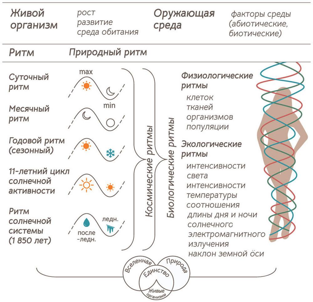 Наибольшее влияние на биоритмы оказывает взаимное расположение Земли, Луны, Солнца и других светил (звезд и созвездий), периоды их вращения вокруг своей оси, продолжительность и смена дня и ночи.