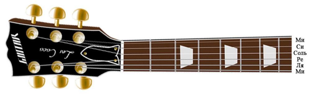 В аппликатурах (как и в табулатурах, которые мы изучим чуть позже) принято рисовать гитарный гриф так, что первая струна находится вверху, а шестая внизу. Но чаще такая аппликатура перевёрнута на 90 градусов по часовой стрелке, так что первая струна оказывается справа, а шестая слева. Далее мы будем использовать именно такую «вертикальную» аппликатуру. Первая открытая струна это нота Ми (E), вторая открытая Си (H), третья Соль (G), четвёртая Ре (D), пятая Ля (A), шестая (как и первая) Ми (E). Это тоже нужно просто запомнить, не пытаясь отыскать здесь никакой логики и закономерности (со временем это придёт само собой). Итак с первой по шестую струну: Ми Си Соль Ре Ля Ми. И точка!