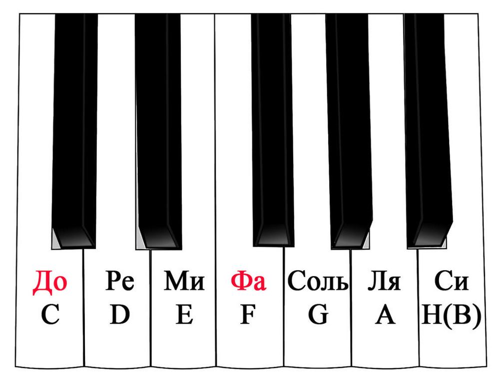 До (обозначается латинской буквой С) Ре (D) Ми (E) Фа (F) Соль (G) Ля (A) Си (H, в западной литературе обозначается буквой B) . Если посмотреть на отдельно взятую октаву фортепиано, то этими нотами будут слева направо белые клавиши, начиная от ноты До. Все следующие октавы повторяются.