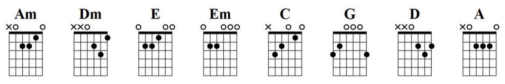 И вот наконец мы подходим непосредственно к построению самих аккордов. Как правило, все начинающие изучать гитару прежде всего учат самые простые аккорды (их восемь). Это Am (Ля минор), A (Ля мажор), Dm (Ре минор), D (Ре мажор), E (Ми мажор), Em (Ми минор), C (До мажор) и G (Соль мажор). Нарисуем их в виде аппликатуры.