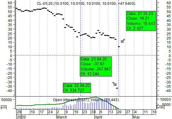 Дата 21.04.2020 расчетная и цена поставки фьючерса CL-05.20, составила 10,01$, тем самым выйдя на экспирацию в положительные значения. Это важно с той точки зрения, что при отрицательной цене продавцам фьючерса на нефть пришлось бы как поставлять нефть, так еще и доплачивать за нее. Однако такого не случилось и ниже мы более детально разберем почему. Количество открытых позиций к моменту поставки составило 2 427 фьючерса.