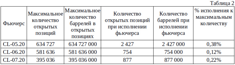Обратим внимание в Таблице 2 на процентное отношение между количеством открытых позиций при исполнении фьючерса к максимальному количеству открытых позиций, т. е. объема реально поставленной нефти. По факту это соотношение показывает, какой реальный процент от всех фьючерсных контрактов выходит на поставку и в среднем этот показатель составляет 0,24 % от всех открытых позиций. С одной стороны, вроде и не секрет, что количество реально поставляемой нефти меньше, чем спекулятивное. При этом из цифр видно, что объем реально поставляемой и продаваемой нефти по фьючерсу не превышает одного процента. Говоря иначе, количество спекулянтов в рассматриваемом фьючерсе составляет 99,76 %, что, мягко говоря, немало.