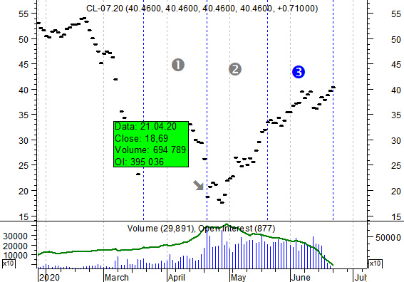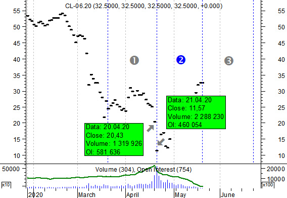 Сравнивая все три рисунка (Рис. 3, Рис. 4 и Рис. 5) хотелось бы показать не только симметричность основного ценового движения, за исключением только одного аномального дня 20.04.20 по фьючерсу CL-05.20, и нормального контанго, но и сделать акцент на объемах открытых позиций и реальных объемах поставляемой нефти. Напомню, что в одном фьючерсе Light Sweet 1000 баррелей нефти.