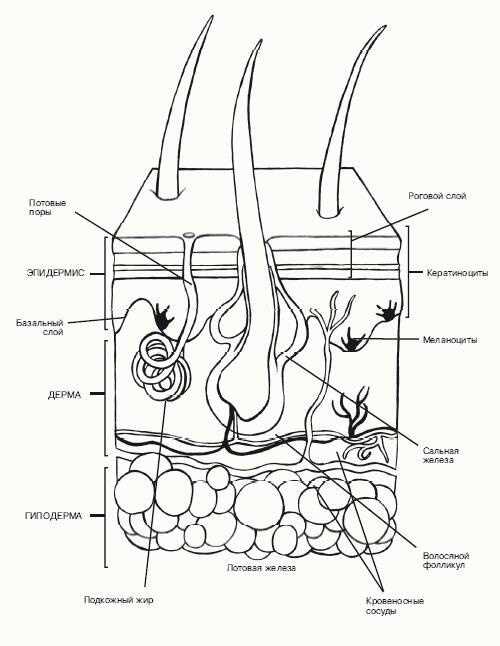 Кожа человека состоит из трех основных слоев: эпидермис (кожица), дерма и гиподерма (подкожно-жировая клетчатка). В каждом из них есть, в свою очередь, дополнительные слои, которые вместе образуют эластичную массу клеток, кровеносных сосудов, сальных и потовых желез. Клетки взаимодействуют с триллионами полезных бактерий и грибков, которые живут внутри и на поверхности. Они определяют степень жирности или сухость покровов и зависят от состояния здоровья и возраста человека, времени года и многих других факторов. В этой главе мы изучим структуру кожи, узнаем, как определить ее статус, и рассмотрим распространенные кожные заболевания. Обратим внимание на внутренние и внешние причины старения кожи, а также на воздействие солнца как отрицательное, так и положительное.