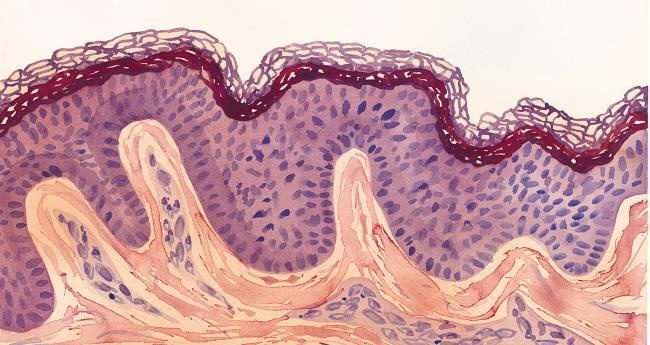 Когда по какой-то причине вам необходимо сделать биопсию, ткани кожи окрашивают в разные цвета и снимок выглядит так. На снимке эпидермис окрашен в лиловый, ядра клеток синие (кератиноциты, меланоциты и фибробласты). Красный и фиолетовый цвет показывают роговой слой сверху, а бежевый богатый коллагеном дермальный слой