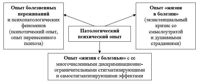 Психопатологический опыт (основа понимания психиатрической проблематики пациента) это совокупность переживаний, привнесенных в жизнь человека событиями и обстоятельствами, связанными как с самим расстройством, так и с его официальным признанием у конкретного пациента. Это новый жизненный опыт, затрагивающий индивидуальность личности, ее духовность и ментальность, и вступающий в диссонанс со сформированной «Я-концепцией» внутреннего мира, значимыми отношениями, с прежним, устоявшимся, сформированным в личности ее прежней жизнью. Этот опыт включает три разновидности переживаний (рис. 7).