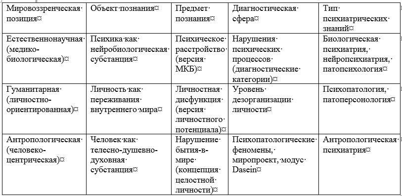 Психиатрия как область знаний о человеке является многослойной сферой познания. Ее рассмотрение не может ограничиваться только психологическими (патопсихологическим) измерениям или нейробиологическим (невропатологическим), или персонологическим (собственно психопатологическим) измерениями. Одномерные подходы к пониманию психиатрии не раскрывают многослойности ее объекта, лишают пациента целостности и многоаспектности его существования, и превращают психиатрию в квазинауку. Предмет подлинной психиатрии это психические расстройства человека, как многослойная антропологическая проблема, охватывающая все слои его бытия.
