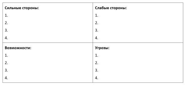 Нам нужно проанализировать ваш будущий бренд с точки зрения его сильных и слабых сторон, а также имеющихся возможностей и потенциальных угроз. В каждом секторе нужно написать по 24 пункта с предельно конкретными формулировками. Естественно, опираясь на ту информацию, которую мы получили при анализе рынка, конкурентов и имеющихся трендов.