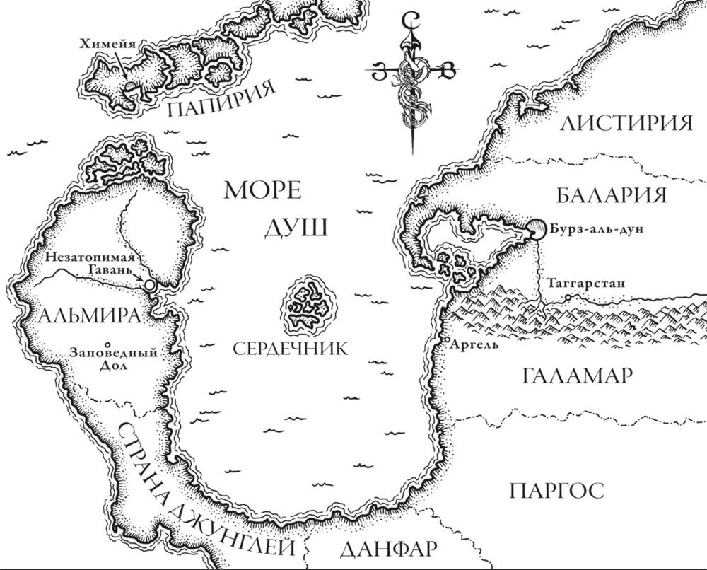 Хороший мореход при попутном ветре проделал бы путешествие меньше чем за две недели, но ветер был встречный, а нескончаемые ливни и шквалы разодрали паруса в лоскуты. После двадцати семи дней плавания беглецы с трудом добрались до Надломленного полуострова россыпи крошечных скалистых островков на полпути из Альмиры в Папирию.