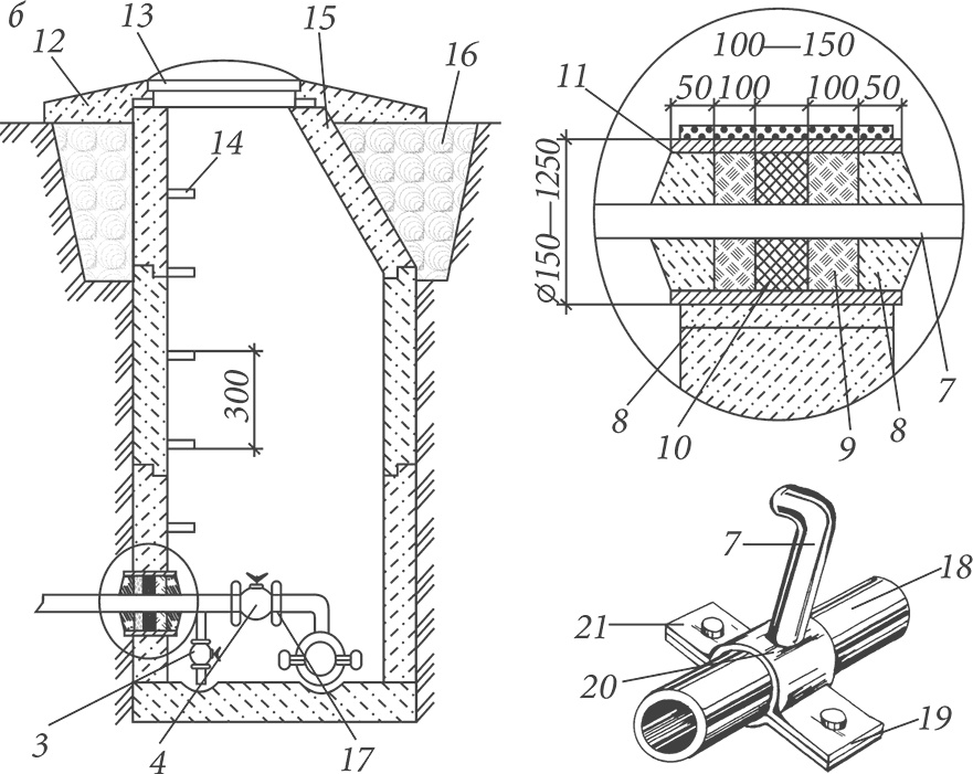 Рисунок 1. Схема водопроводного ввода (размеры указаны в миллиметрах) (окончание): б уличный водоразборный колодец; 4) вентиль; 3) сливной кран; 7) трубопровод ввода; 8) цементный раствор; 9) пакля; 10) жирная глина; 11) канал 12) отмостка; 13) люк; 14) скобы; 15) бетонное кольцо; 16) глиняный замок; 17) заземление; 18) труба уличного ввода; 19) прокладка; 20) сварка; 21) хомут
