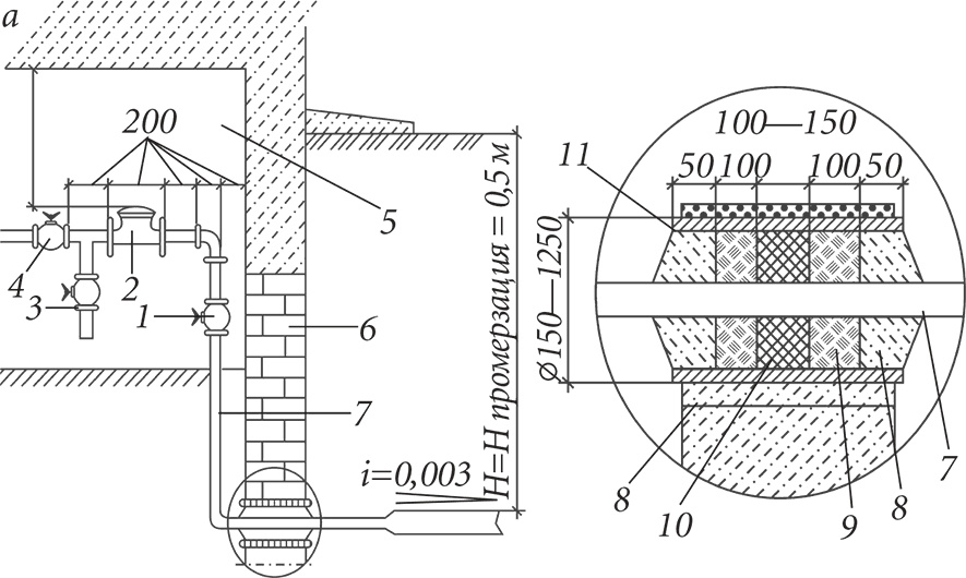 Рисунок 1. Схема водопроводного ввода (размеры указаны в миллиметрах): а индивидуальный дом; 1, 4) вентиль; 2) водомер; 3) сливной кран; 5) подвал; 6) фундамент; 7) трубопровод ввода; 8) цементный раствор; 9) пакля; 10) жирная глина; 11) канал