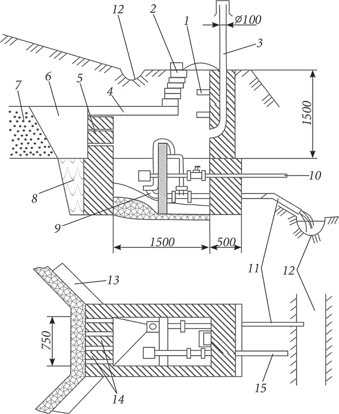 Рисунок 4. Ключевой колодец нисходящего типа (размеры указаны в миллиметрах): 1) ходовые скобы; 2) кирпичная кладка; 3) вентиляционная труба; 4) перекрытие; 5, 14) дренаж; 6) гравийный фильтр; 7) водоносный горизонт; 8) глиняный замок; 9) сливная воронка; 10, 15) водозаборная труба; 11) переливная труба; 12) водоотводная канава; 13) открылки