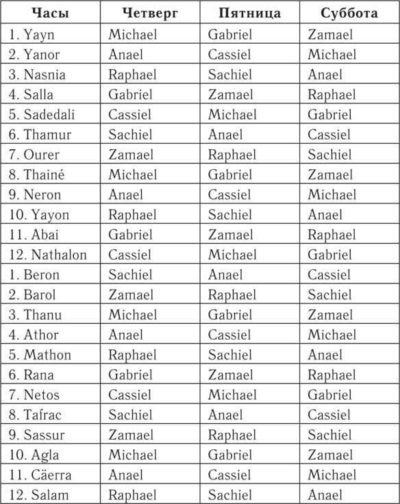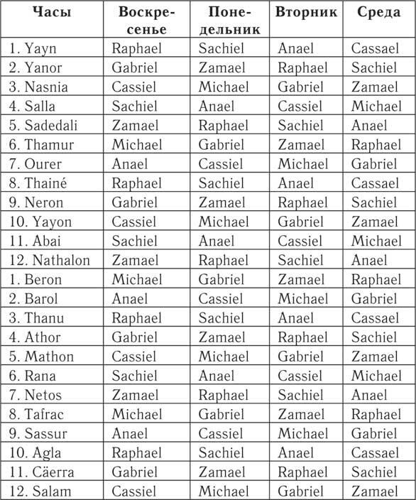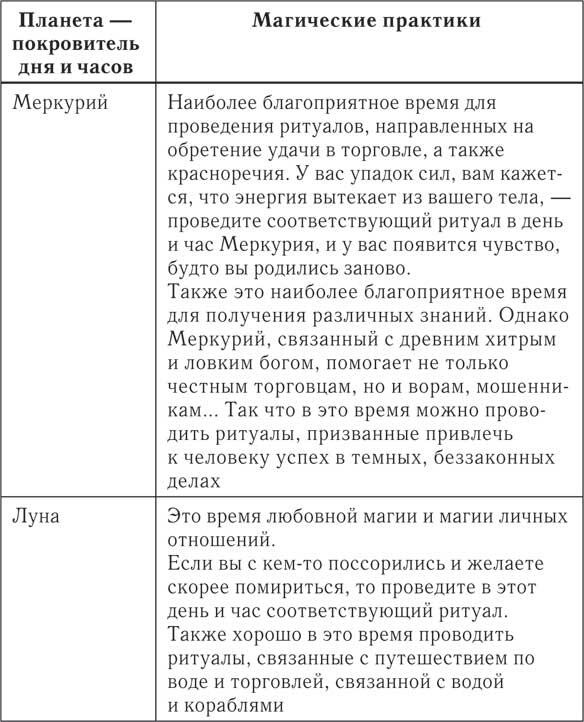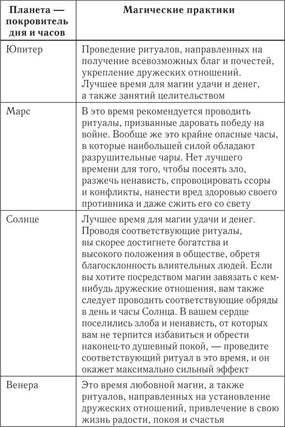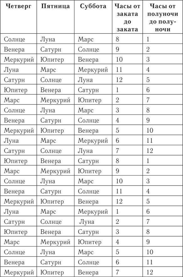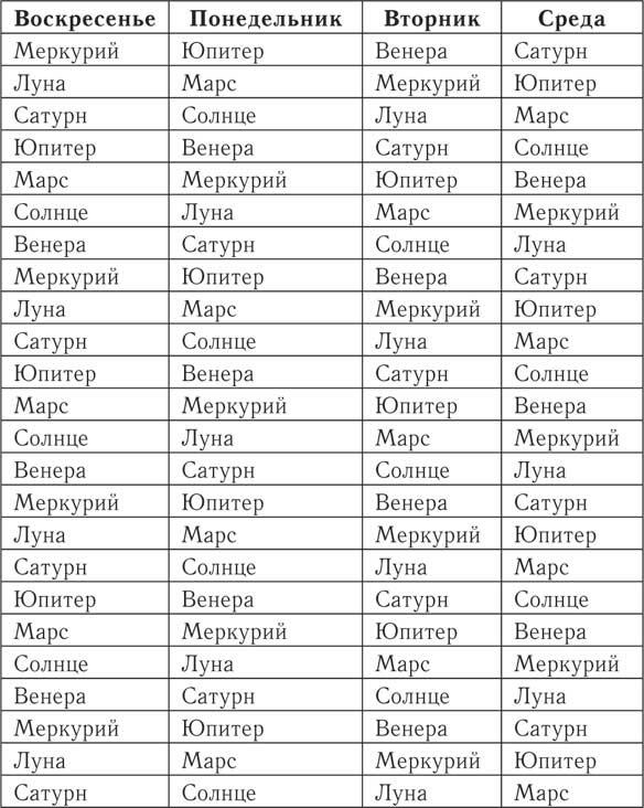 Теперь вам нужно запомнить порядок планет: Солнце, Венера, Меркурий, Луна, Сатурн, Юпитер и Марс. Запомнили? Прекрасно. Начинаем еще один отсчет. В понедельник сразу же после часа Луны идет час Сатурна, затем Юпитера и, наконец, Марса. Все, планеты закончились, а заход еще не скоро. Ничего страшного. Нужно просто начинать отсчет сначала, только на этот раз не с Луны, а с самой первой планеты списка Солнца. Итак, у нас получается следующая цепочка; Луна Сатурн Юпитер Марс Солнце Венера Меркурий Луна Сатурн и т. д. Так мы просчитываем все двадцать четыре часа.
