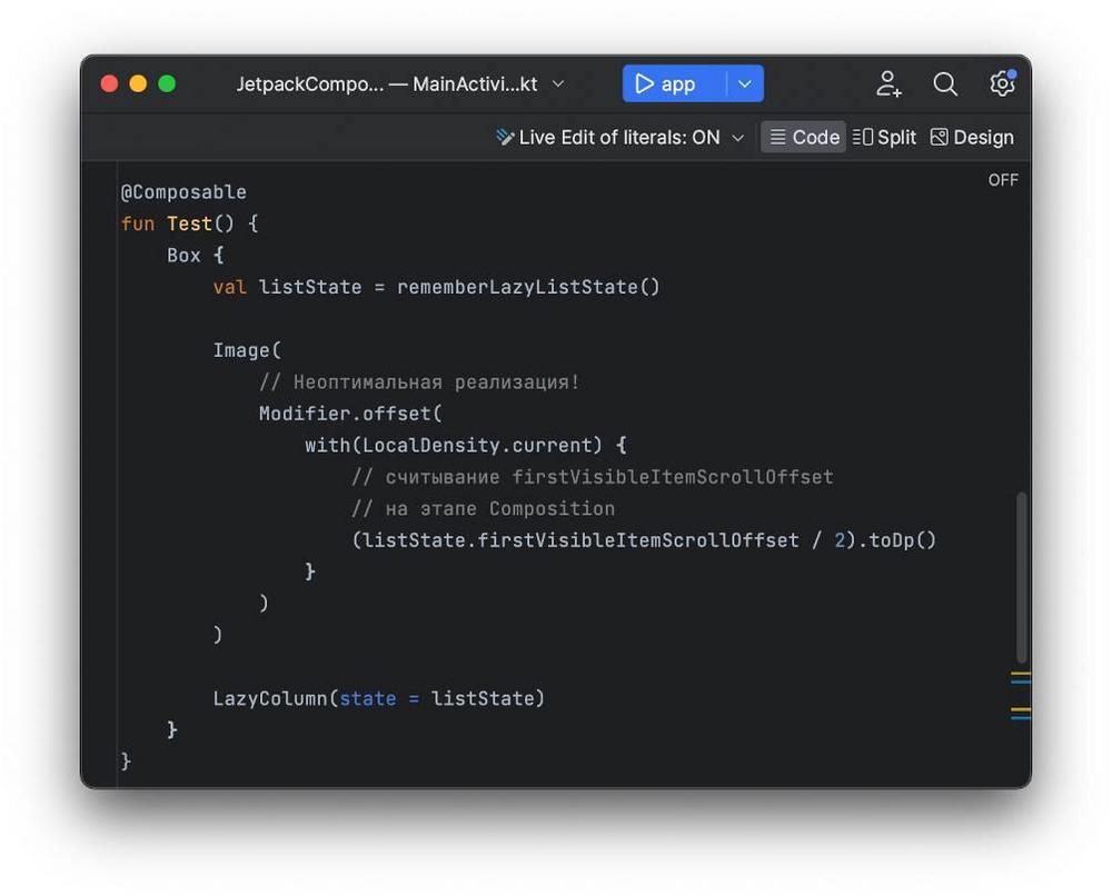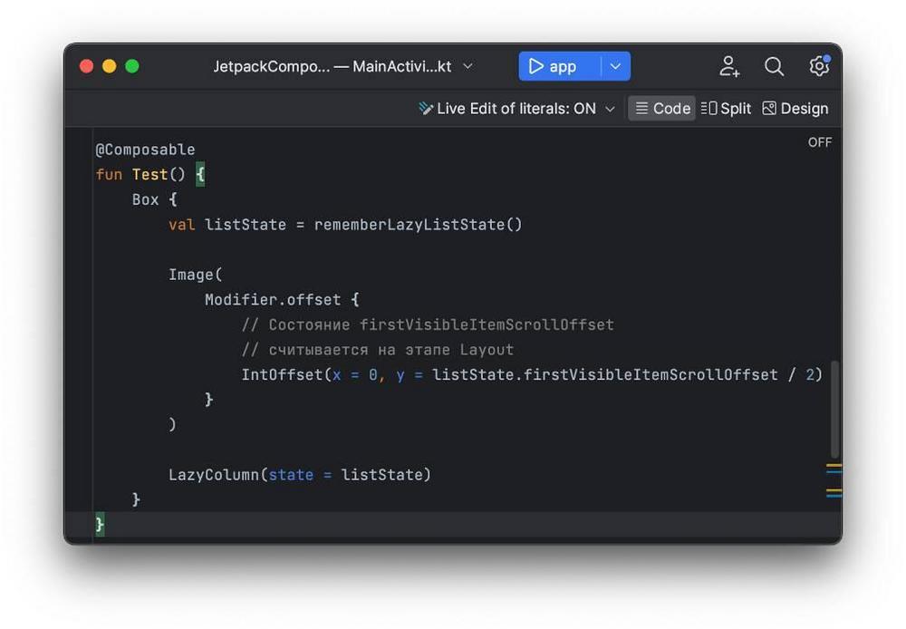 В этом примере состояние читается внутри этапа Composition. Это необязательно плохо. Фактически это основа рекомпозиции, позволяющая при изменении данных создавать новый UI. Причина не оптимальности кода в примере выше в том, что каждое событие скролла приводит к переоценке всего существующего composable-composable-, и затем новому измерению, расположению и финальной отрисовке.