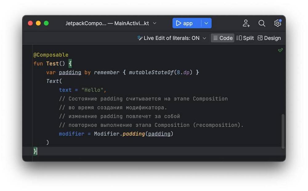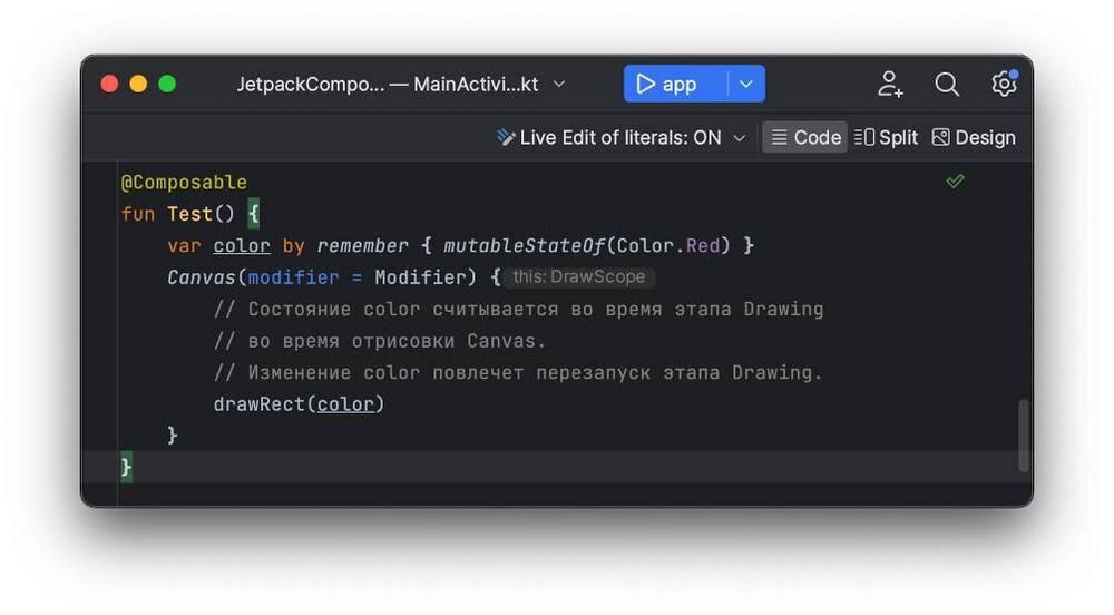 Почему этот способ более производительный? Лямбда, которую мы предоставляем модификатору, вызывается во время этапа Layout если быть точнее, во время шага размещения что означает, что наше состояние Layout больше не считывается во время этапа Layout. Compose отслеживает, когда состояние считано. Поэтому, если значение Layout меняется, Compose должен только перезапустить этапы Layout и Layout.