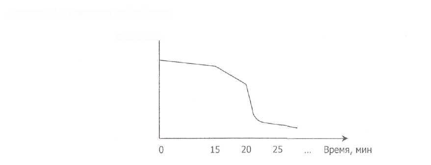 Внимание человека всегда приковано к тому, что ему интересно. Если пропадает интерес, то внимание рассеивается. Исследования показывают, что привлеченное внимание удерживается не более, чем в течение 15-20 минут (рисунок 10.3), а затем начинает падать. Удержать внимание (привлечь его снова) можно, вызвав интерес собеседника (поддерживая интерес).