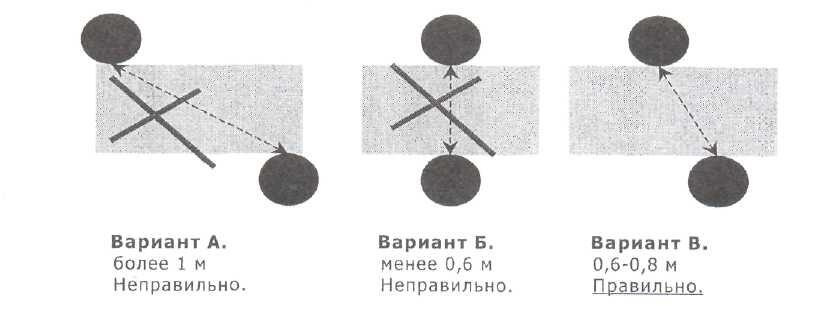 Необходимо при посадке следить за тем расстоянием, которое установилось между специалистом по продажам и собеседником. Расстояние не должно быть слишком маленьким или очень большим. Например, расстояние менее 50-60 см означает проникновение в «интимную зону» покупателя и может быть ему неприятно, так как в этой зоне он общается с близкими людьми. Расстояние, большее 1-1,2 м не позволит общаться так, чтобы можно было нормально говорить (не кричать), рисовать иллюстрации и показывать материалы. Таким образом, желательно располагаться на расстоянии 0,6-0,8 м. Не следует садиться прямо напротив собеседника или рядом с ним (исключая непосредственно показ демо-версии, когда по-другому сесть невозможно). Наилучший вариант сидеть немного вполоборота.
