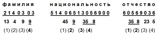 Из последней схематичной записи видно, что очерёдность трёх слов по их взаимному определению следующая: отчество определяет национальность, национальность определяет фамилию. Однако, попытаемся дополнить эту цепочку, подобрав аналогичным образом слова-основы для понятия отчество. Для этого нам придётся подобрать слово, у которого на 1-м и 2-м месте будет стоять набор цифр 23 5. Запишем цепочку.