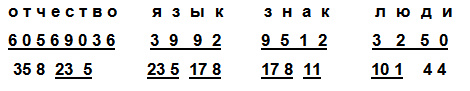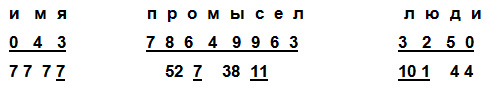 С другой стороны, между тремя оставшимися словами существует отчётливо прослеживающаяся связь. Чтобы понять её суть, необходимо помнить, что наборы дополнительных цифр связываются между собой одинаковыми 4-м и 2-м числами (или ещё лучше, парами чисел: 3-е и 4-е должно совпадать с 1-м и 2-м числами).