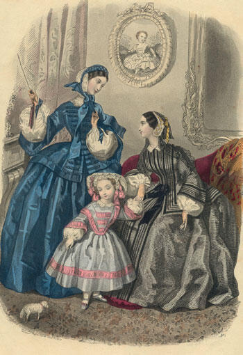 На модной иллюстрации 1857 года из Magasin des Mademoiselles показаны дневные ансамбли, оба с лифами в виде жакета с баской, рукавами «пагода» и белыми ангажантами (манжетами с кружевными многослойными оборками). На обеих женщинах домашние чепцы, а платье девочки отражает влияние взрослой моды.