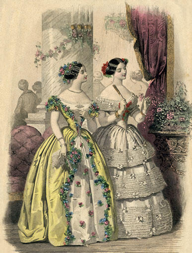 На иллюстрации из Grahams Paris Fashions вы видите вечерние платья начала 1850-х годов. Вернувшееся влияние XVIII века выражено в наличии верхней юбки у желтого туалета, тогда как многоярусная юбка белого платья оставалась в моде несколько лет. В вечерних прическах женщины цветами и лентами подчеркивали пробор по центру и носили складной веер.