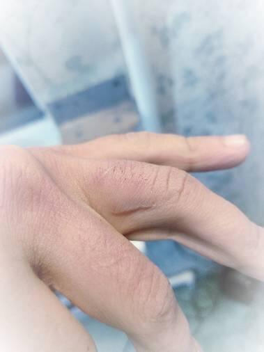 Шрам от насквозь прошедшие лезвие ножниц: