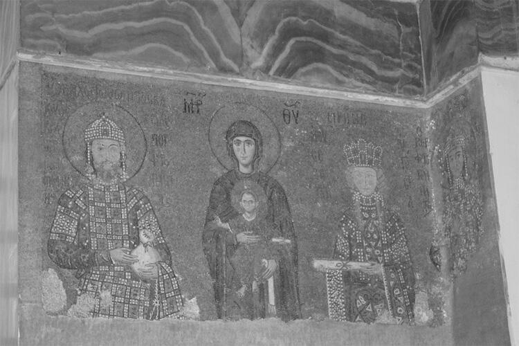 Император Иоанн II Комнин и императрица Ирина Венгерская перед Богоматерью. Слева от императрицы Алексей Комнин старший сын августейшей четы. Мозаика из южного придела собора Святой Софии в Константинополе