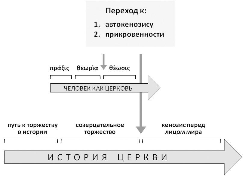В частности, на основании метода разномасштабной исторической типологии[31] нами уже предлагалась гипотеза, согласно которой Вселенские Соборы представляют собой исторически локальное явление. Исторический момент прекращения деятельности Вселенских Соборов типологически сходен с моментом в личной истории отдельного «человека как церкви»[32], характеризующем переход от созерцательного торжества и видимого выражения единства внутренних сил (θεωρία) к его таинственному, жертвенному и, тем самым, более глубокому выражению (θέωσις)[33].