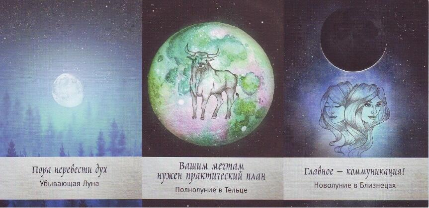 Красивая колода, представляет из себя полный набор фаз Луны, её состояний (затмения и прочее), а также Новолуния и Полнолуния в различных Знаках Зодиака. То есть, это астрологическая колода.