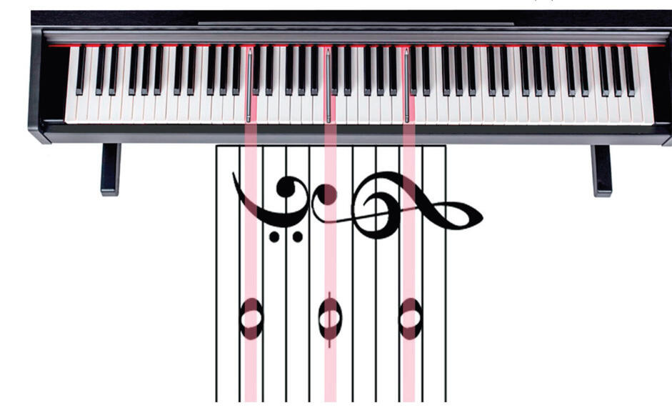 Теперь попробуем представить нотные станы в виде струн на грифе некоего инструмента и развернем этот гриф перпендикулярно клавиатуре. Отметим центральное положение ноты ДО первой октавы на нотном стане и мысленно соединим её с соответствующей клавишей. То же самое проделаем с нотами ДО малой октавы и ДО второй октавы (рис. 18).