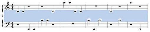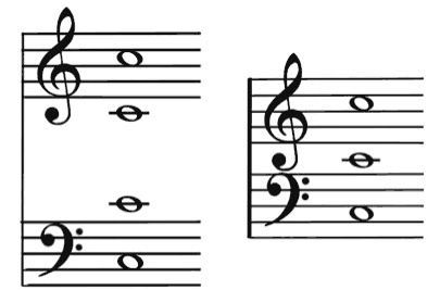 Так мы увидим идеальную зеркальную симметрию в нотной графике и точную связь начертания нот с их положением на фортепианной клавиатуре. Это хорошо видно и при обычном расположении фортепианной системы: ноты ДО малой и второй октав записываются во втором промежутке между линиями нотного стана, только на верхнем нотоносце это второй промежуток сверху, а на нижнем снизу (рис. 19).