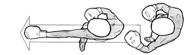 Примечание. Кулак бьющей руки при ударе может быть направлен большим пальцем кверху, что может несколько удлинить удар, но тогда будет затруднено защитное движение плечевого сустава, которым боксер прикрывает подбородок от ударов справа.