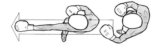 Note. When punching, the fist is pointed thumb up: this will make the punch longer, however in that case it will be harder for the opponent to use his shoulder to cover the chin from the right punch.