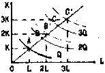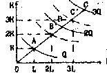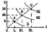 Если выпуск увеличится менее, чем в k раз (Q1<kQ0), то имеет место убывающая отдача от масштаба. 0A < AB < BC