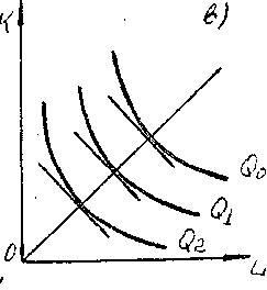 Если в результате выпуск увеличится также в k раз (Q1 = kQ0), то имеет место постоянная отдача от масштаба. (0A = AB = AC)