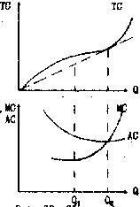 Во многих производствах возрастающая отдача от масштаба сменяется при достижении определенного объема выпуска убывающей. Производственной функции с таким переменным характером отдачи от масштаба соответствует и меняющаяся конфигурация кривой долгосрочных затрат. До определенного уровня производства кривая LTC выпукла вверх, а сверх него вниз.