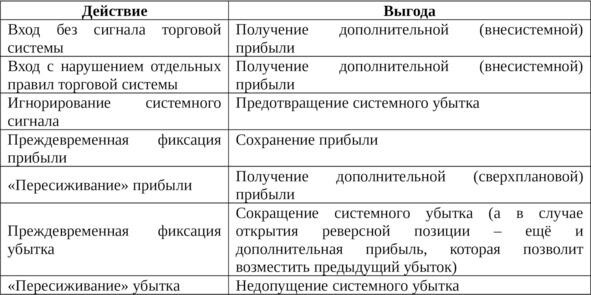 Нетрудно заметить, что у всех торговых ошибок прослеживается один общий мотив стремление максимизировать прибыль и минимизировать убыток (или вовсе его избежать) по каждой сделке. И именно этот мотив составляет базис «количественной» парадигмы! Потребность зарабатывать деньги, совершая выигрышные сделки и избегая проигрышей, вынуждает трейдера нарушать правила. И в конечном итоге приводит его к тому, от чего он больше всего хотел уберечься. В погоне за деньгами, он принимает торговые решения исходя из текущего состояния своего торгового счёта, а не из предписаний системы. Его поступки определяются сиюминутной финансовой выгодой, а не долгосрочными перспективами (Таблица 3).