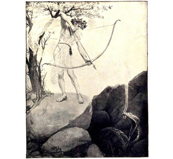 Однажды жители Дельф пришли к Аполлону и стали молить его изгнать или уничтожить их ужасного врага. Итак, взяв поутру в руки свой серебряный лук, он вышел на рассвете, чтобы встретиться с чудовищем, когда оно должно было выйти из своей скользкой пещеры. Мерзкое существо отпрянуло назад, когда увидело перед собой сияющего бога, и охотно спряталось бы в глубоких ущельях горы. Но Аполлон быстро выпустил в него острую стрелу, воскикнув: «Ты, исчадие ада, проклятие человека, ложись в землю и обогащай ее своим мертвым телом!» И никогда не ошибающаяся стрела попала в цель; и великий зверь умер, барахтаясь в своей крови. И народ в своей радости вышел навстречу божественному лучнику, распевая песнопения в его честь; и они увенчали его полевыми цветами и венками из олив и приветствовали его как пифийского царя; и соловьи пели ему гимны в рощах, и ласточки и цикады щебетали и настраивали свои мелодии в гармония с его лирой.9